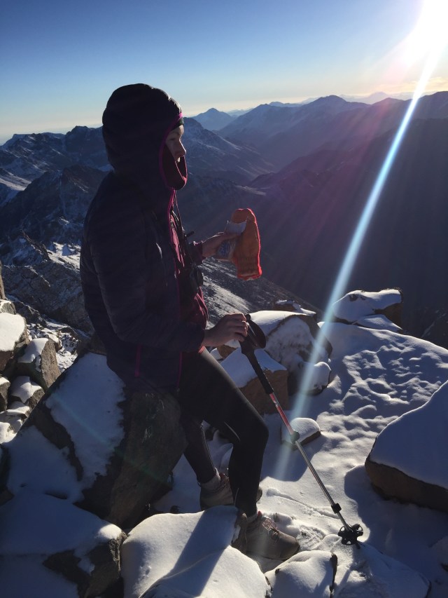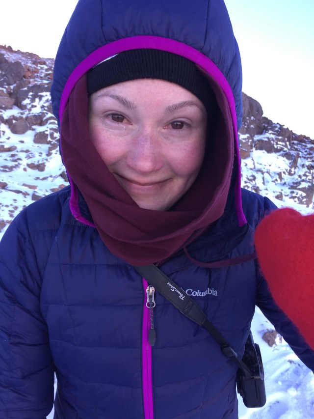 For kit I wore two layers of tights, two base layers and a sweater. I had a puffer jacket and for a scarf I just used a tank top. I had mitts on as well and the only two things I wish I had was a head torch for the early hours and sun glasses for the rest.