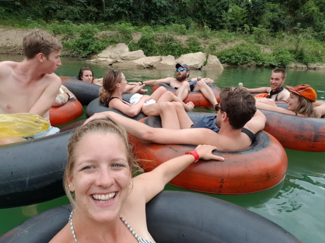 We drove back to the hostel just in time to get changed and go on the tubing experience. We saw all the same couples that were at Nam Xay Top View and we formed a group. A tuk tuk came to pick us up with loads of tubes tied to the top. It drove us to the river and dropped us off with a tube and hand. Follow the tide, you’ll hear music, when you get close, someone with throw you a rope and pull you into the bar. Ok…… You basically get to this floating barge on the side of the river with speakers blaring, loads of people jumping up and down dancing, a bar at the back and a diving board off the side. It was A LOT of fun. You buy drinks, dance and the bar will eventually close. At this point you grab a tube (any tube) and you float on down to the next bar. Hundreds of people floating down the river with a beer in hand. You do this a few times until you get to the last bar which has a massive zip line and volleyball court. I recommend you bring very little with you if you do this. We stupidly brought a towel which is completely unnecessary. You just need some money, and a dry back for your phone (if you want to bring it), and if you’re smart you’ll also pack your own beer for the river.